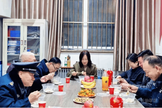 焦雨一行来到南校保卫部值班室、北校值班室、监控室等地,现场调度检查了校园安防情况,听取了保卫部负责人对假期安全工作的情况汇报,与值班人员亲切交谈,详细询问了除夕当天的值班值守安排、校园安全巡查路线、监控系统运行、消防设施排查等情况,感谢他们舍小家、顾大家,坚守岗位守护校园平安,并为他们送上热腾腾的饺子,与他们共吃团圆饭,让坚守岗位的值班人员在寒冷的冬日里感受到了学校大家庭的温暖。